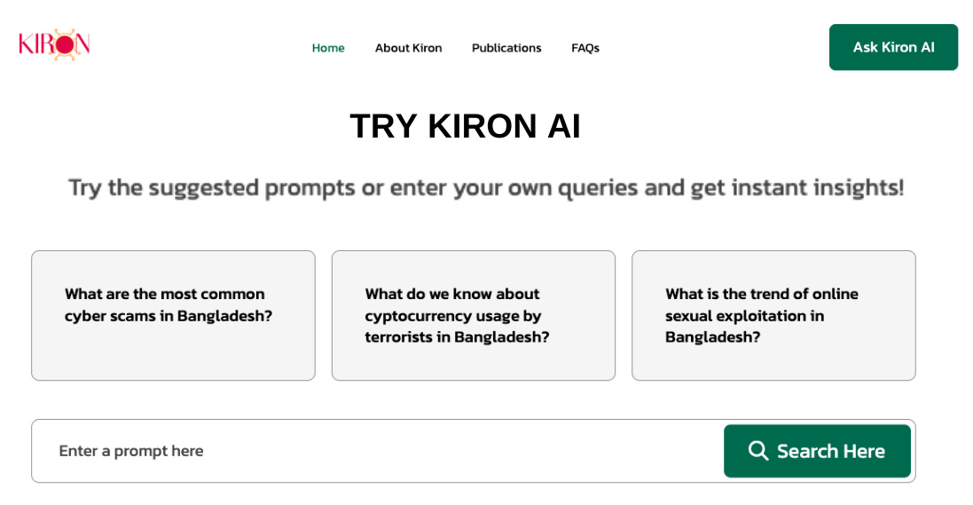 We are excited to announce Kiron AI, our innovative AI tool designed to assist you in research, particularly in the areas of digital harms and extremism in Bangladesh.